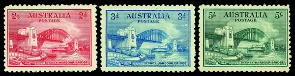 7624 og 130-132 image1932 Sydney Bridge complete (Scott 130-132), complete set of singles, o.g., hinged, Fine to Very Fine.