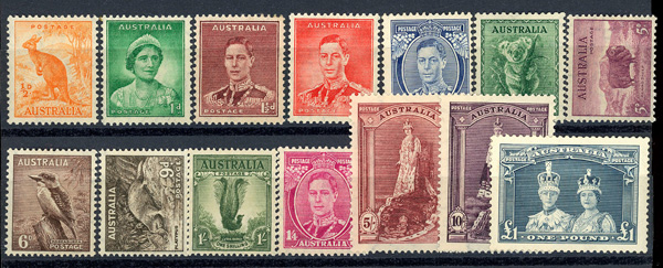 7626 nh 166-179 image1937-46 King George VI definitives, ½d-£1 complete (Scott 166-179), complete set of singles, o.g., never hinged, Very Fine.