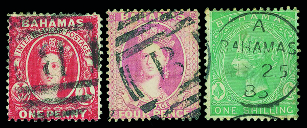7646 O 20-22 image1882, Queen Victoria 1p vermillion, 4p rose, 1sh green (Scott 20-22), singles, Fine to Very Fine.