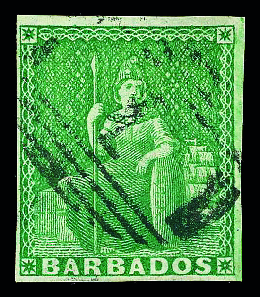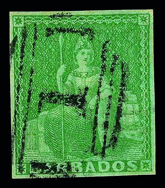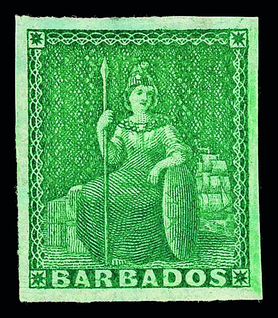 7661 og 1 image1852, "Britannia" (½d) deep green, imperf, blued paper (Scott 1), single, o.g., hinge remnants, Fine.
