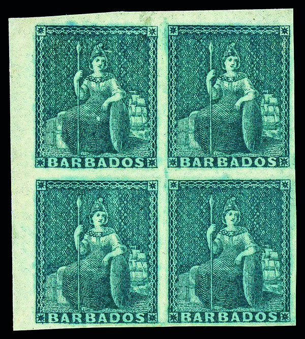 7664 nh/ogbl 3 image1852, "Britannia" (2d) slate blue, imperf, blued paper (Scott 3), block of 4, o.g., bottom 2 stamps never hinged, Very Fine.
