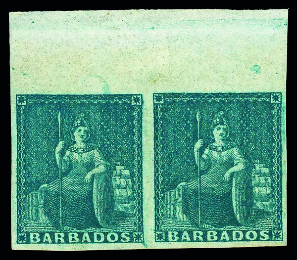 7663 nh 3 image1852, "Britannia" (2d) slate blue, imperf, blued paper (Scott 3), pair, o.g., never hinged, Very Fine.