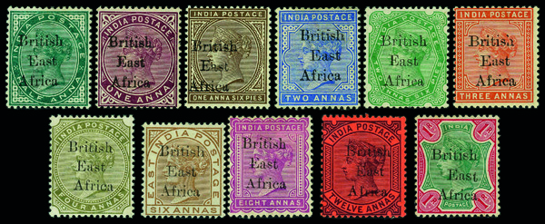 7726 og 54-58,62-65,67 image1895, Queen Victoria Indian stamps over printed British East Africa (Scott 54-58,62-65,67), singles, o.g., hinge remnant, Fine to Very Fine.