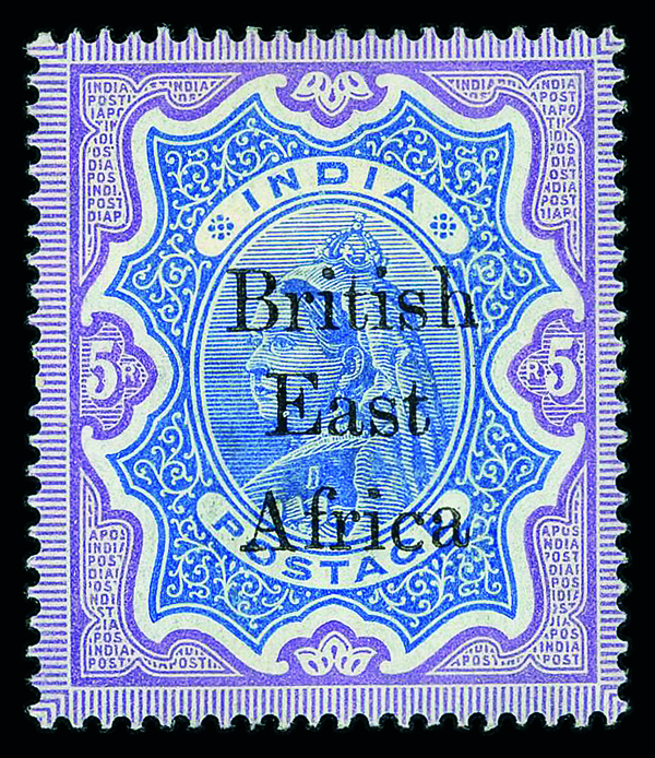 7731 og 70 image1895, "British East Africa" on India 5r ultramarine & violet (Scott 70), single, o.g., hinge remnant, Fine to Very Fine.