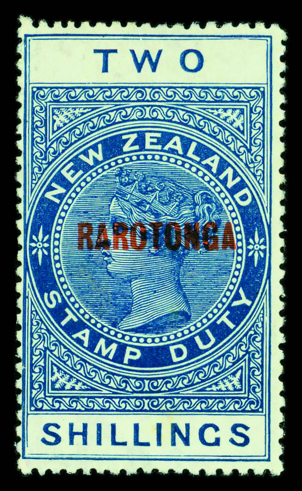 7805 og 67 image1921, New Zealand 2sh blue Postal-Fiscal stamp over printed Rarotonga (Scott 67), single, o.g., lightly hinged, Very Fine.