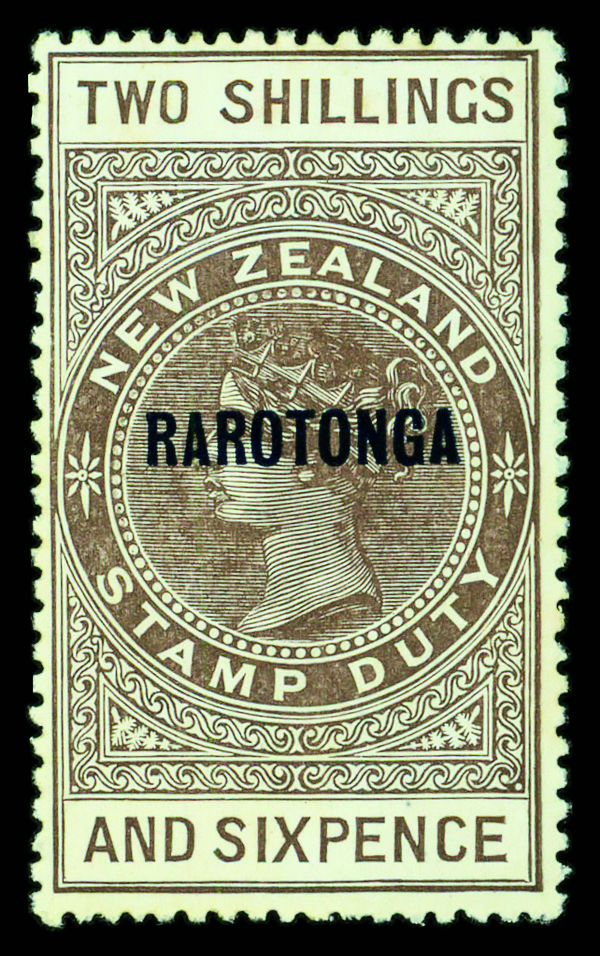 7806 og 68 image1921, New Zealand 2sh6p brown Postal-Fiscal stamp over printed Rarotonga (Scott 68), single, o.g., lightly hinged, Very Fine.