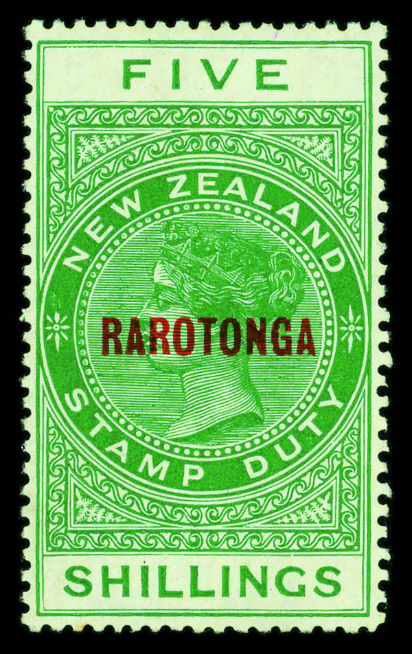 7807 og 69 image1921, New Zealand 5sh green Postal-Fiscal stamp over printed Rarotonga (Scott 69), single, o.g., lightly hinged, Very Fine.