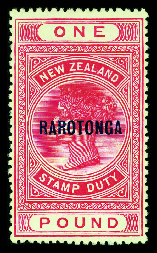 7809 og 71 image1921, New Zealand 1£ rose Postal-Fiscal stamp over printed Rarotonga (Scott 71), single, o.g., lightly hinged, Very Fine.