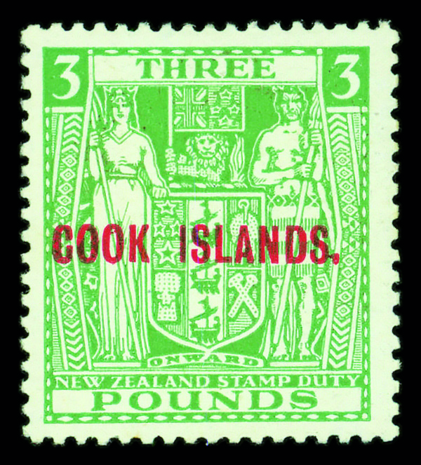 7810 og 107 image1932, New Zealand 3£ green Postal-Fiscal stamp over printed Cook Islands (Scott 107), single, o.g., hinge remnant, Very Fine.
