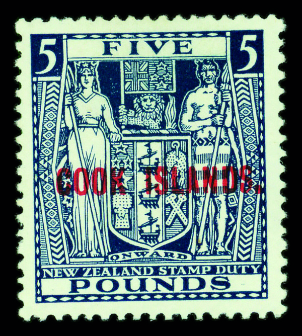 7811 og 108 image1932, New Zealand 5£ dark blue Postal-Fiscal stamp over printed Cook Islands (Scott 108), single, o.g., hinge remnants, Very Fine.
