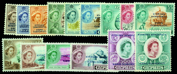 7818 nh 183-197 image1960, Republic overprints on Queen Elizabeth II Pictorials, 2m to £1 complete (Scott 183-197), set of 15, complete set of singles, Scott 186, 187, 18 and 192 have the inter-action with the mount., o.g., never hinged (spot of gum disturbance from mount reaction), Fine to Very Fine.
