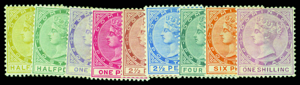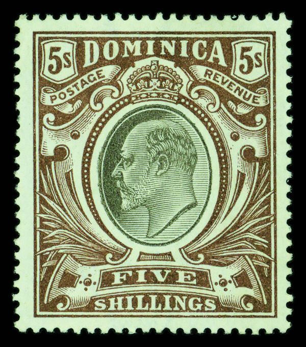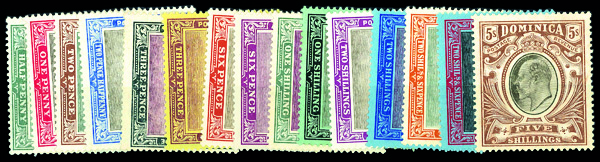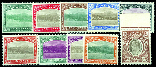 7832 og 25-34 image1903, Roseau & King Edward VII, ½d to 5s complete (Scott 25-34), complete set of singles, o.g., lightly hinged, Very Fine, Scott 34 is mint never hinge.