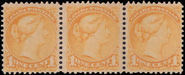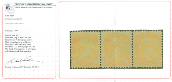 7966 nh 35 image1870, Small Queen, 1¢ yellow (Scott 35), horizontal strip of 3, o.g., never hinged, fresh color, Fine to Very Fine, with a 2010 Gratton certificate as "Extremely Fine".