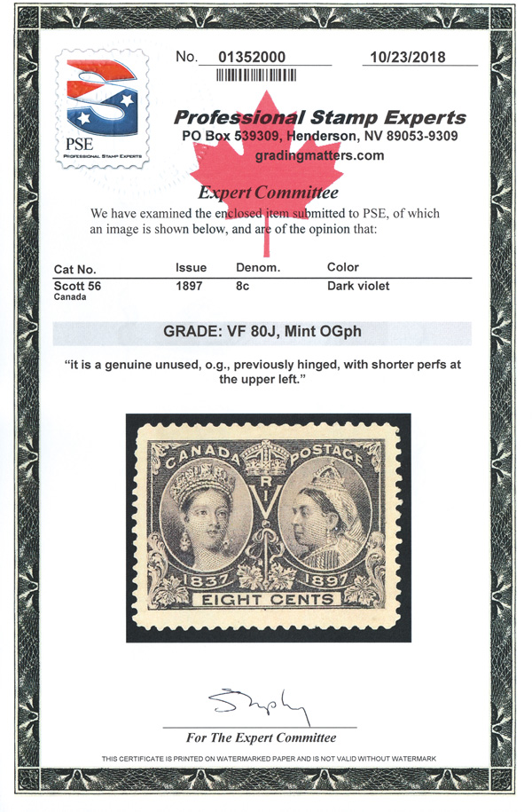 7985 og 56 image1897, Queen Victoria Jubilee, 8¢ dark violet (Scott 56), a fresh, beautifully centered, enormous Jumbo, o.g., barely hinged; couple shortish perfs at the upper left, Very Fine. Striking! with a 2018 P.S.E. certificate graded VF 80J noting the perfs.
