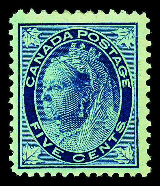 7992 og 70 image1897, Queen Victoria "Maple Leaf", 5¢ dark blue, on bluish paper (Scott 70), single, o.g., hinge remnant, Very Fine.