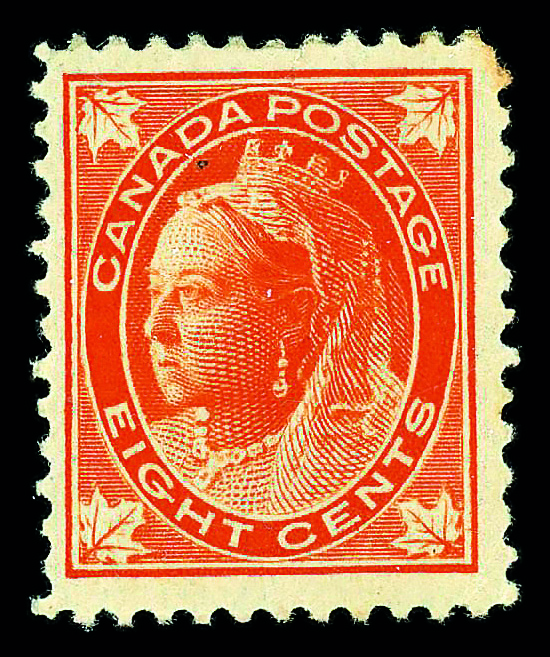 7995 og 72 image1897, Queen Victoria "Maple Leaf", 8¢ orange (Scott 72), single, o.g., hinge remnant; Top right pulled perforation., Fine to Very Fine.