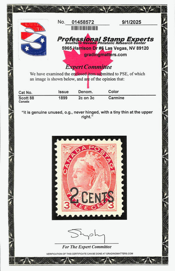 8002 og 88 image1899, Queen Victoria "Numeral", 2¢ on 3¢ carmine (Scott 88), near-perfect centering amidst "jumbo" margins, lovely color, unblemished o.g., Extremely Fine and choice; tiny thin at upper right on perf tip, with 2025 P.S.E. certificate.