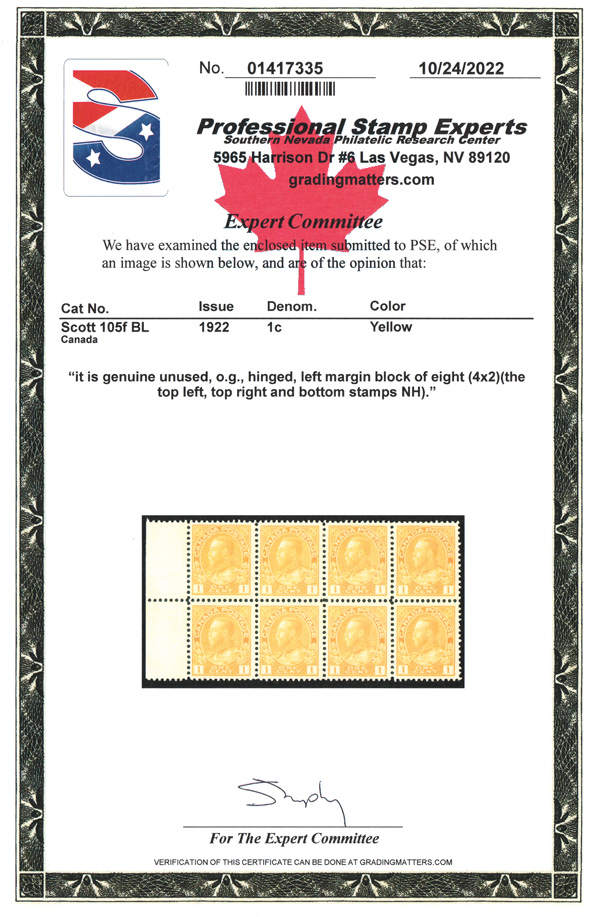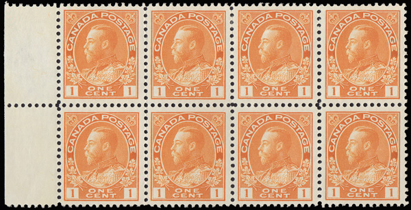 8022 nh/ogbl 105f image1922, King George V "Admiral", 1¢ yellow, dry printing, type I (Scott 105f), left sheet margin block of 8, o.g., all but two top middle stamps never hinged, fresh and well centered, Very Fine, with a 2022 P.S.E. certificate.