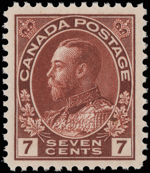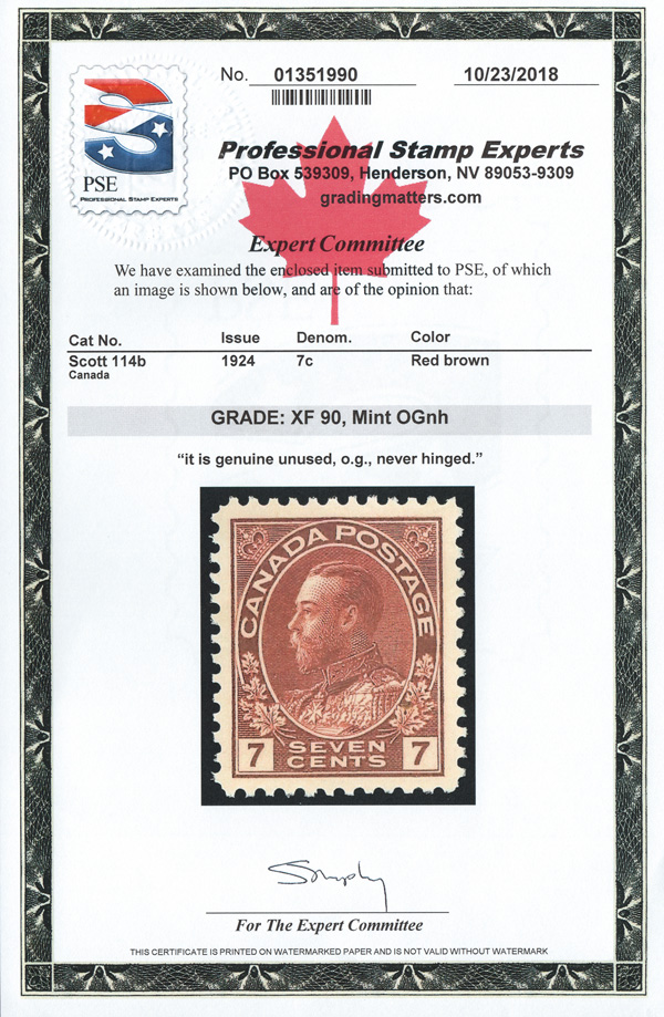 8038 nh 114b image1924, King George V "Admiral", 7¢ red brown, wet printing (Scott 114b), o.g., never hinged, exceptionally fresh and beautifully centered, Extremely Fine, with a 2018 P.S.E. certificate graded XF 90.