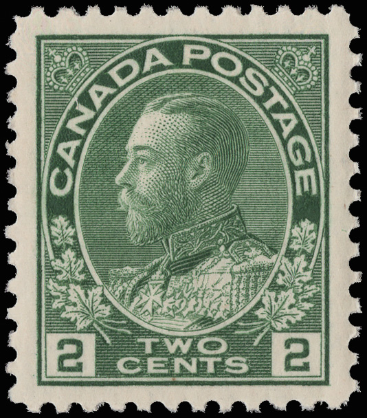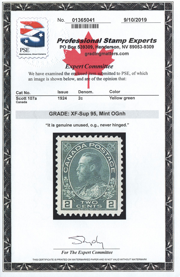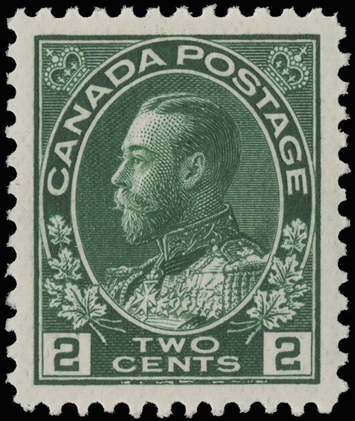 8026 nh 107a image1924, King George V "Admiral", 2¢ deep green, thin paper, wet printing (Scott 107a), a choice mint single, o.g., never hinged, wonderfully fresh and mathematically centered, Extremely Fine to Superb, with a 2018 P.S.E. certificate graded XF-SUP 95.