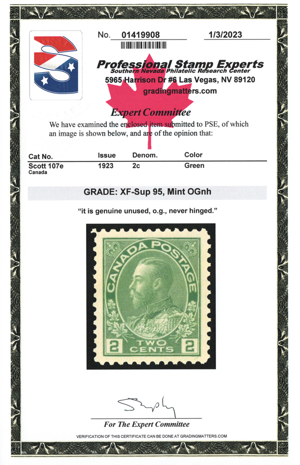 8027 nh 107e image1923, King George V "Admiral", 2¢ green, dry printing (Scott 107e), o.g., never hinged, exceptionally fresh and wonderfully well centered, Extremely Fine to Superb, with a 2023 P.S.E. certificate graded XF-SUP 95.