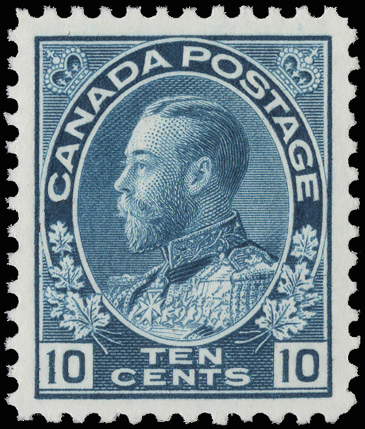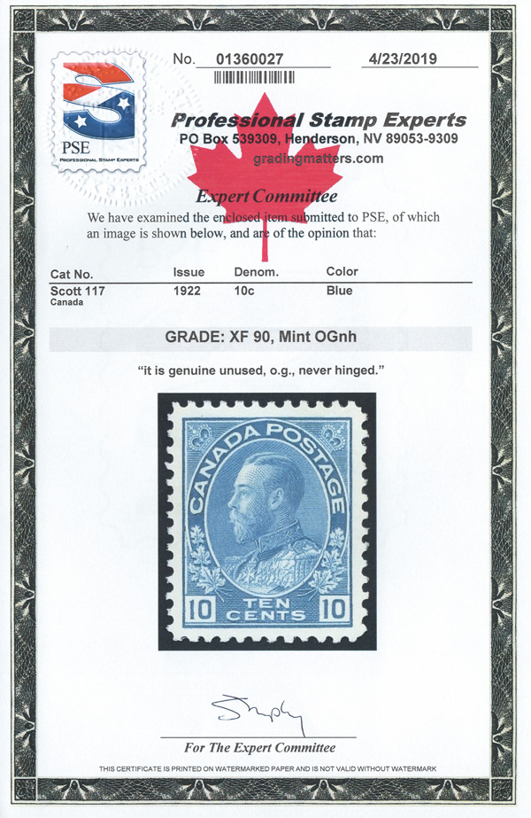 8040 nh 117 image1922, King George V "Admiral", 10¢ blue, wet printing (Scott 117), an exceptional mint single, o.g., never hinged, wonderfully fresh and beautifully centered with outstanding color, Extremely Fine, with a 2019 P.S.E. certificate graded XF 90.
