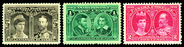 8009 og 96-98 image1908, ½¢ - 2¢ Quebec Tercentenary (Scott 96-98), singles, o.g., lightly hinged, Fine to Very Fine.