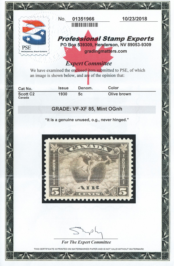 8154 nh C2 imageAirmail, 1930, 5¢ olive brown (Scott C2), o.g., never hinged, incredibly fresh and beautifully centered, Very Fine to Extremely Fine, with a 2018 P.S.E. certificate graded VF-XF 85.
