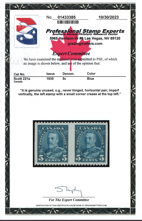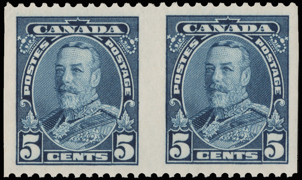 8128 nh 221a image1935, King George V, 5¢ blue, horizontal pair, imperf. vertically (Scott 221a), o.g., never hinged, fresh and bright with nice margins; small corner crease at the upper left, otherwise Very Fine. Only 150 pairs produced., with a 2023 P.S.E. certificate.
