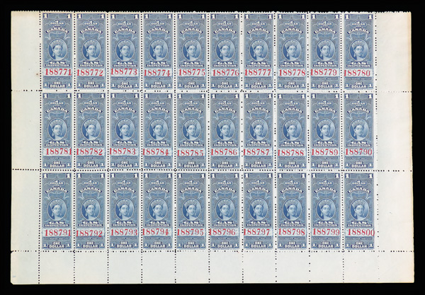 8156 nhbl FG22a image1897, $1 Queen Victoria Gas Inspection, worn design behind red control number (Van Dam FG22a), bottom margin block of 30, o.g., never hinged, wonderfully fresh with razor-sharp detail and attractive centering; faintest of toning at tops of positions 1-3; some light separations, still Very Fine, signed each with Bilesky handstamp.