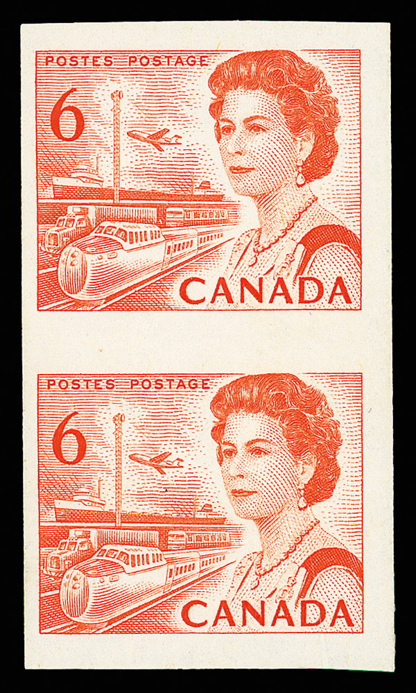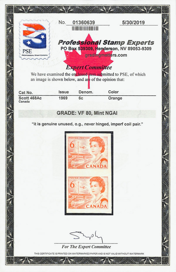 8151 nh 468Ac image1969, 6¢ Queen Elizabeth II & Transportation coil, orange, imperf (Scott 468Ac), pair, o.g., never hinged, pristine with rich, bright color, Very Fine, with 2019 P.S.E. certificate graded VF 80 (erroneously as "no gum as issued").