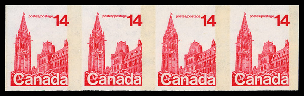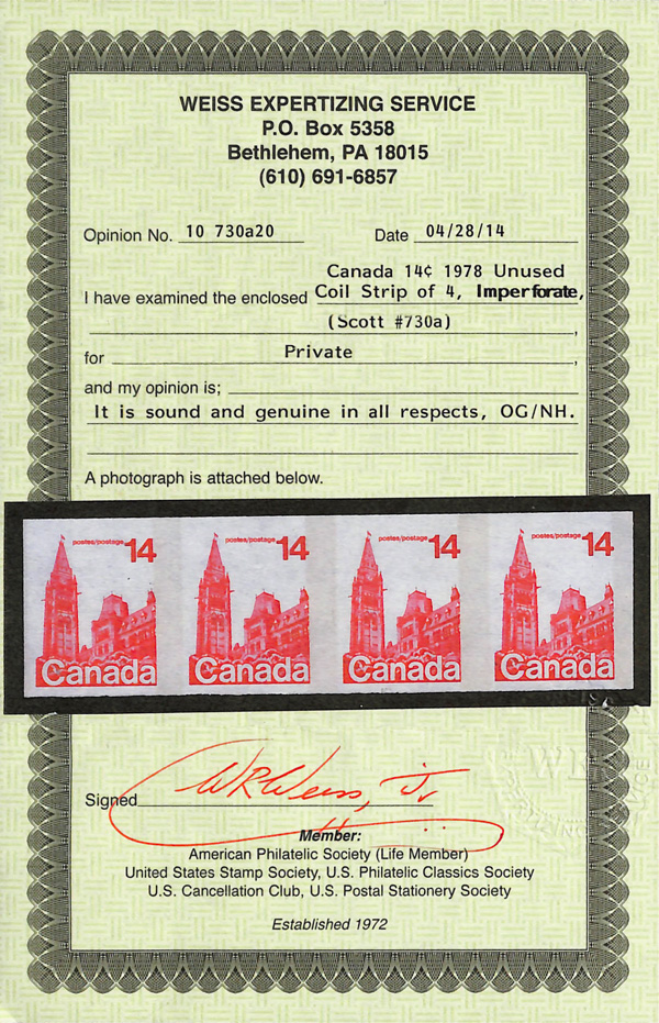 8152 nh 730a image1978, 14¢ Parliament coil, imperf (Scott 730a), strip of 4, o.g., never hinged, fresh and sound with rich color on bright paper, Very Fine, with 2014 Weiss certificate.
