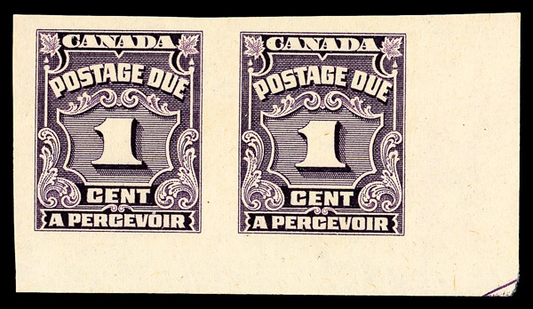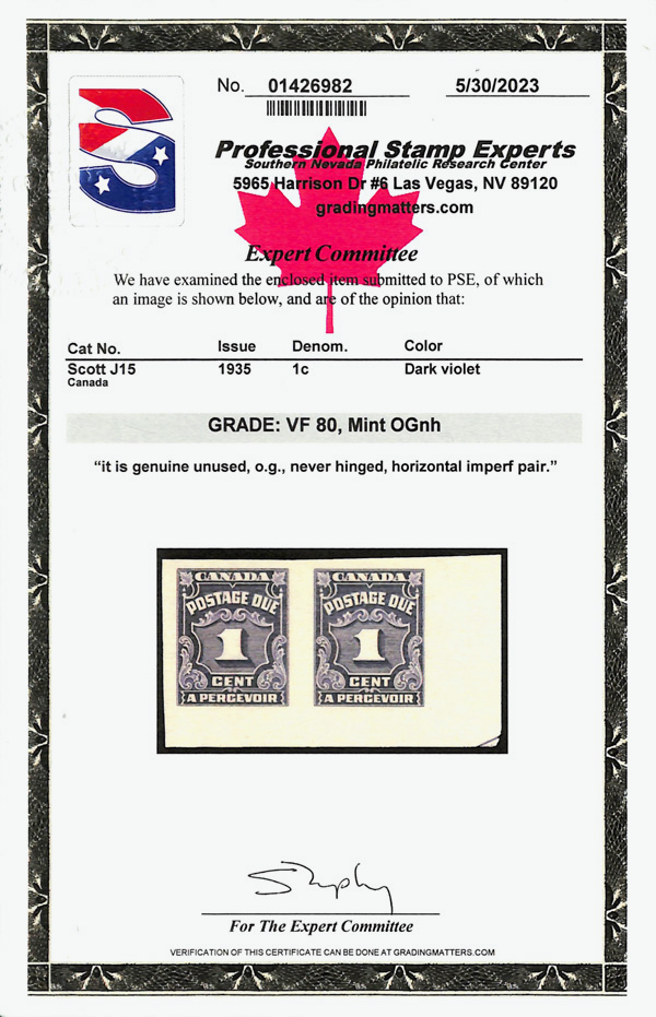 8158 nh J15a imagePostage Due, 1935, 1¢ dark violet, imperforate pair (Scott J15a), o.g., never hinged, lovely horizontal pair from bottom right of pane with part arrow in far selvage corner, fresh and sound, Very Fine, only 100 pairs issued, with 2023 P.S.E. certificate graded VF 80 (erroneously as #J15).