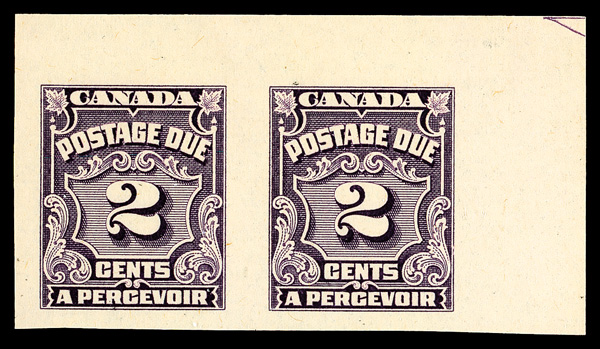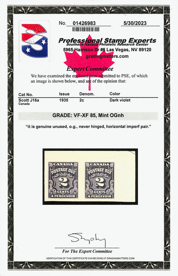 8159 nh J16a imagePostage Due, 1935, 2¢ dark violet, imperforate pair (Scott J16a), o.g., never hinged, Post Office fresh top right corner pair with part arrow in selvage; sound with wide margins, Very Fine to Extremely Fine, only 100 pairs issued, with 2023 P.S.E. certificate graded VF-XF 85.
