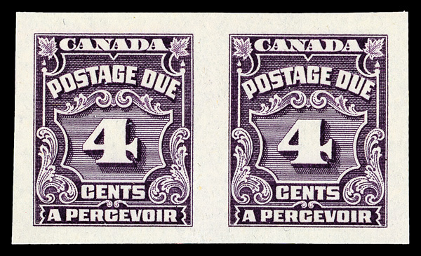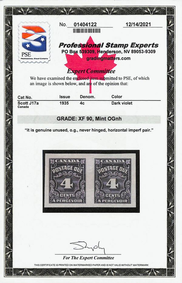 8160 nh J17a imagePostage Due, 1935, 4¢ dark violet, imperforate pair (Scott J17a), o.g., never hinged, fresh horizontal pair with rich color and full, balanced margins, Extremely Fine, only 100 pairs issued, with 2021 P.S.E. certificate graded XF 90.