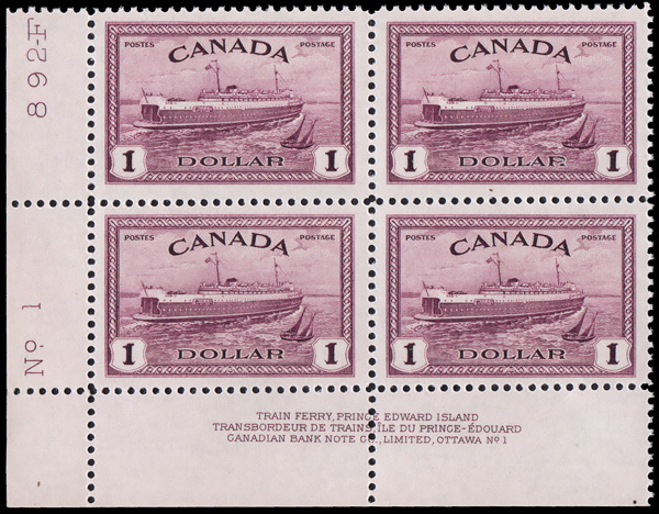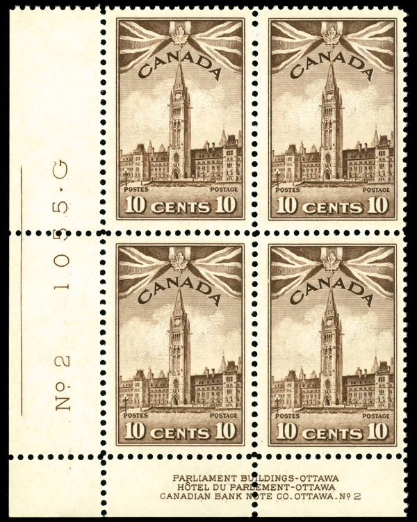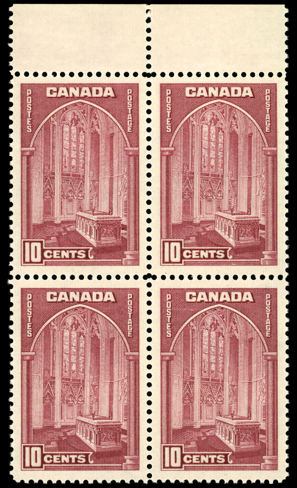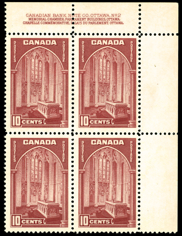8143 nhbl 257 image1942, 10¢ Parliament Buildings (Scott 257), plate block of 4, o.g., never hinged, Extremely Fine.