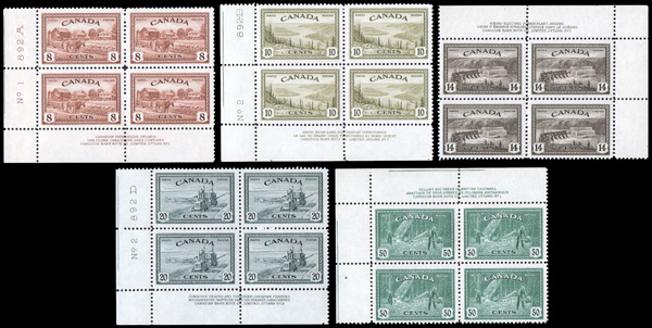 8148 nhbl 268-273 image1946, King George VI "Peace" definitives, 8¢ to $1 complete (Scott 268-273), each in a plate block of 4, o.g., never hinged, Very Fine.