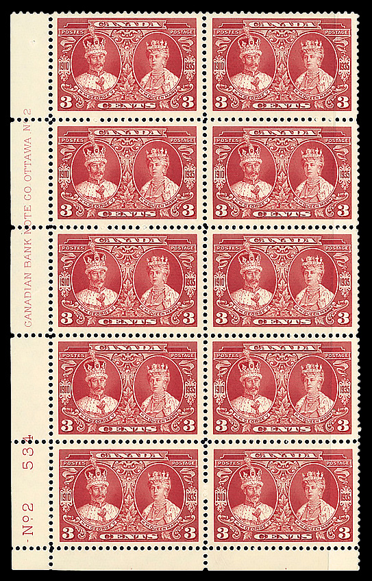 8124 nhbl 213 image1935, 3¢ King George V and Queen Mary (Scott 213), plate block of 10, o.g., never hinged, Extremely Fine.