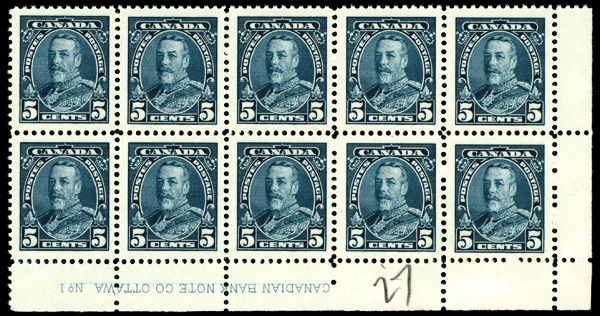 8127 nhbl 221 image1935, King George V, 5¢ blue (Scott 221), plate block of 10, o.g., never hinged, Extremely Fine.