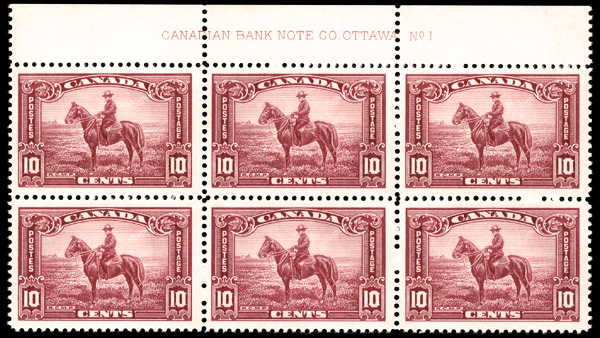 8129 nhbl 223 image1935, 10¢ Mounted Police (Scott 223), plate block of 6, o.g., never hinged, Extremely Fine.