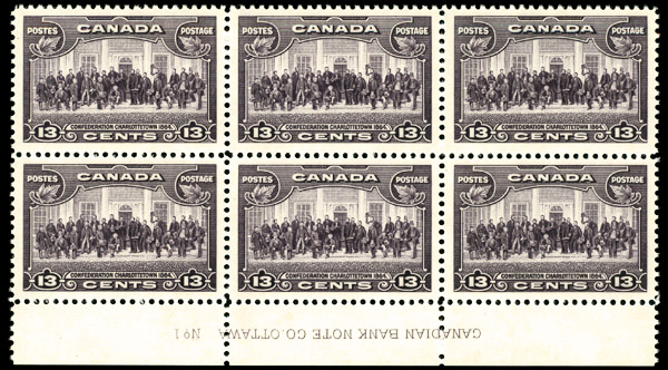 8130 nhbl 224 image1935, 13¢ Charlottetown Conference (Scott 224), plate block of 6, o.g., never hinged, Extremely Fine.