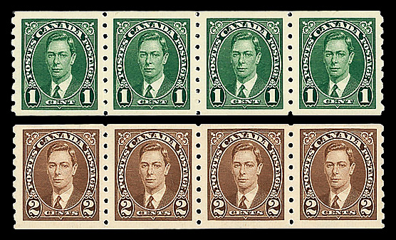 8136 nh 238-240 image1937, King George VI, horizontal coils, perf. 8 vertically, 1¢ to 3¢ complete (Scott 238-240), set of 3, strips of 4, o.g., never hinged, Very Fine to Extremely Fine.