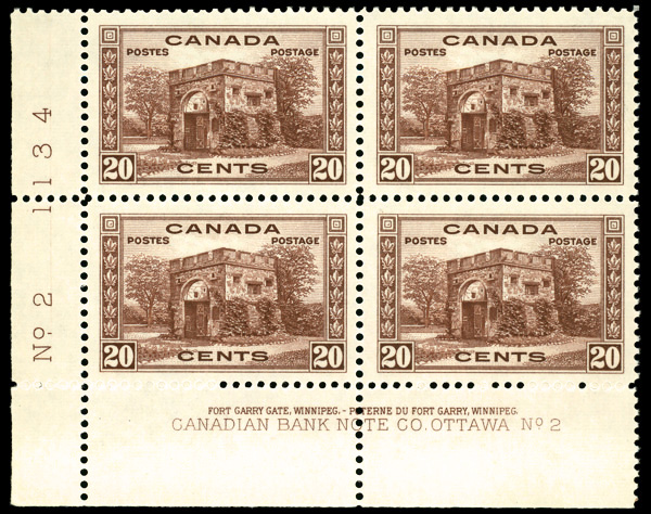 8140 nhbl 243 image1938, 20¢ Fort Garry Gate (Scott 243), plate block of 4, o.g., never hinged, Extremely Fine.