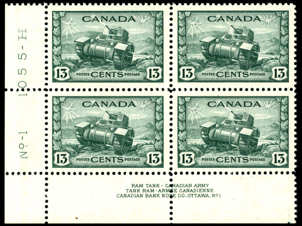 8144 nhbl 258 image1942, 13¢ Tank (Scott 258), plate block of 4, o.g., never hinged, Extremely Fine.