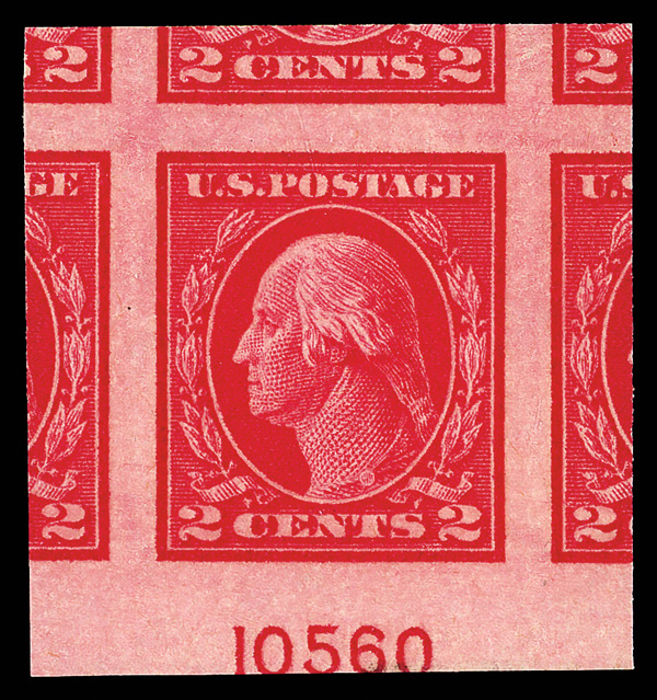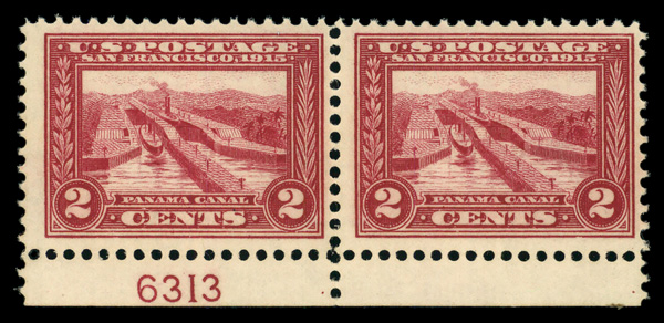 7102 nh 398 image1913, 2¢ Panama-Pacific, perf. 12 (Scott 398), bottom margin pair with plate number, o.g., never hinged, Fine to Very Fine.