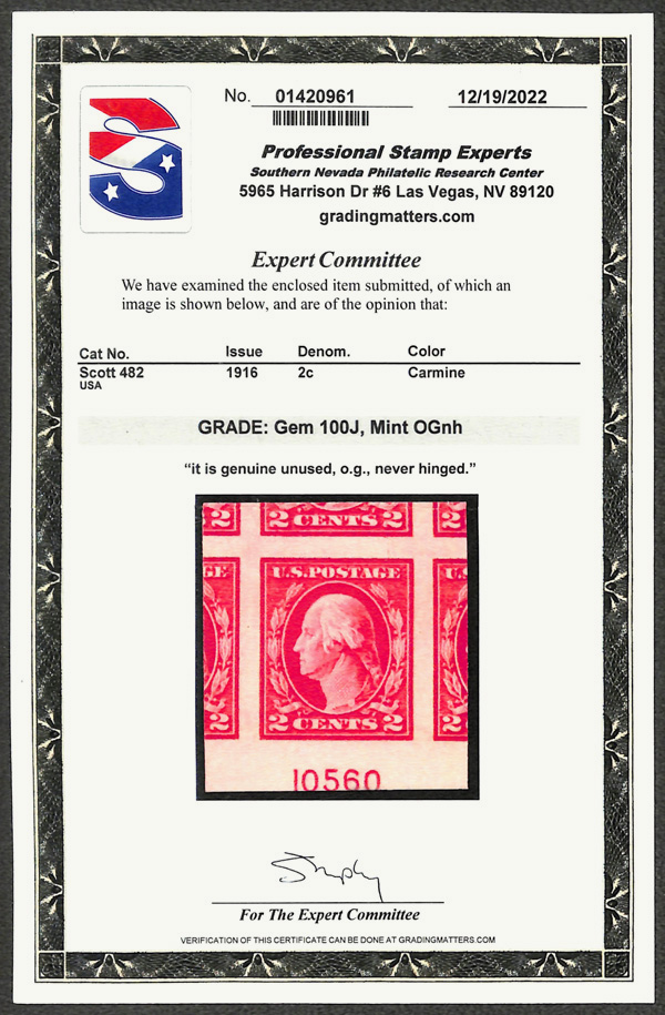 7113 nh 482 image1916, 2¢ carmine, type I, unwatermarked, imperf. (Scott 482), the maximum Stamp Market Value price is for Gem 100 and this stamp is graded 100J and should be priced considerably higher, o.g., never hinged, with 2022 P.S.E. certificate graded GEM 100J.