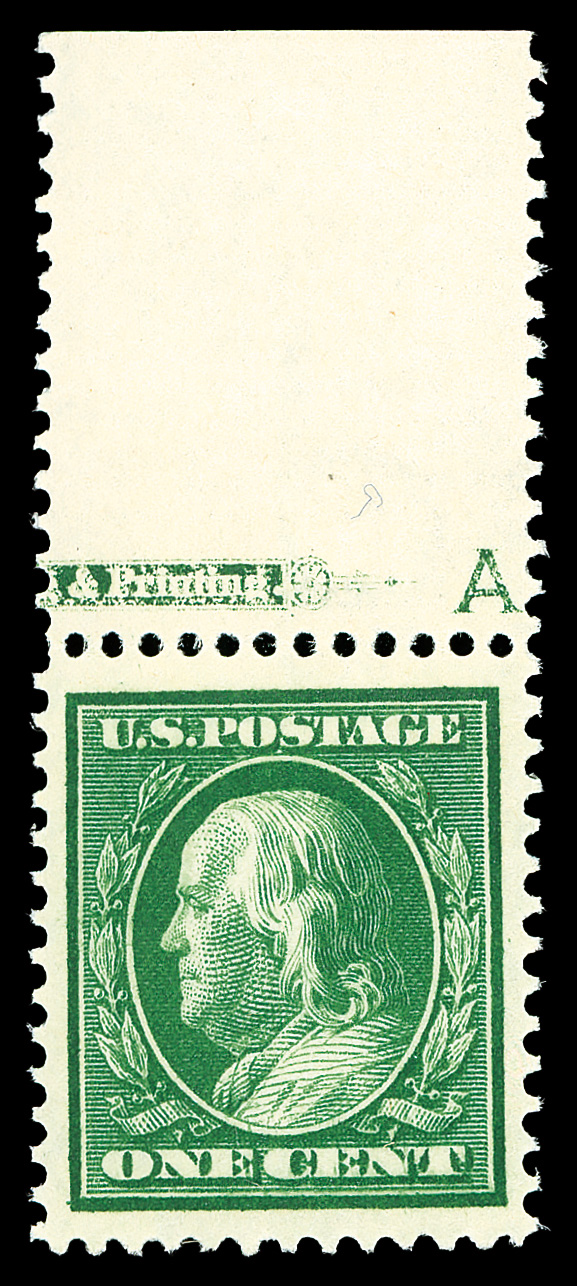 7097 nh 374 image1910, 1¢ green, S.L. watermark (Scott 374), full wide top margin part imprint single, o.g., never hinged, a superlative example in every way, sound and bright, Extremely Fine to Superb, one of the nicest we've seen. (Image) Suggested Bid $64