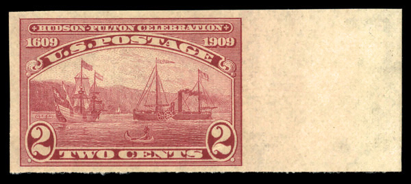 7095 nh 373 image1909, 2¢ Hudson-Fulton, imperf. (Scott 373), right margin single, o.g., never hinged, Very Fine.