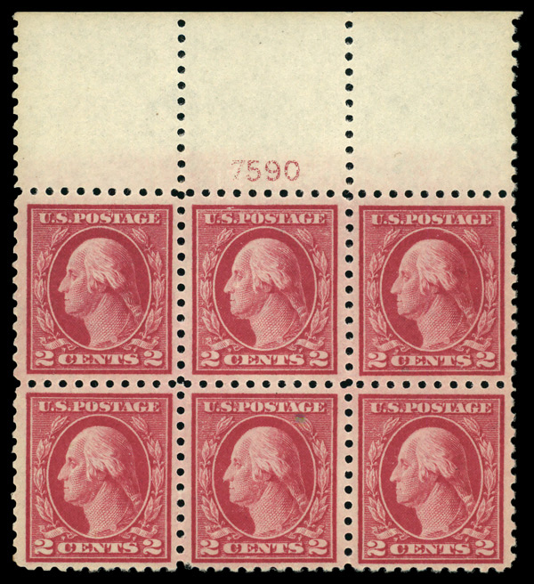 7106 nhbl 425 image1914, 2¢ rose red, type I, S.L. watermark, perf. 10 (Scott 425), plate block of 6, o.g., never hinged, Very Fine.