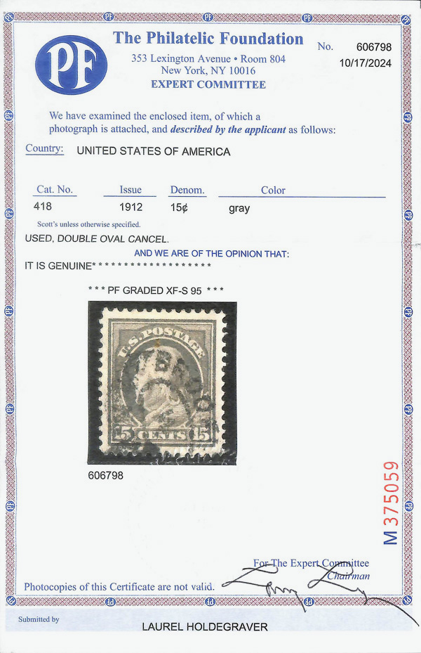 7105 O 418 image1912, 15¢ gray, S.L. watermark, perf. 12 (Scott 418), Extremely Fine to Superb, with 2024 P.F. certificate graded XF-SUP 95.